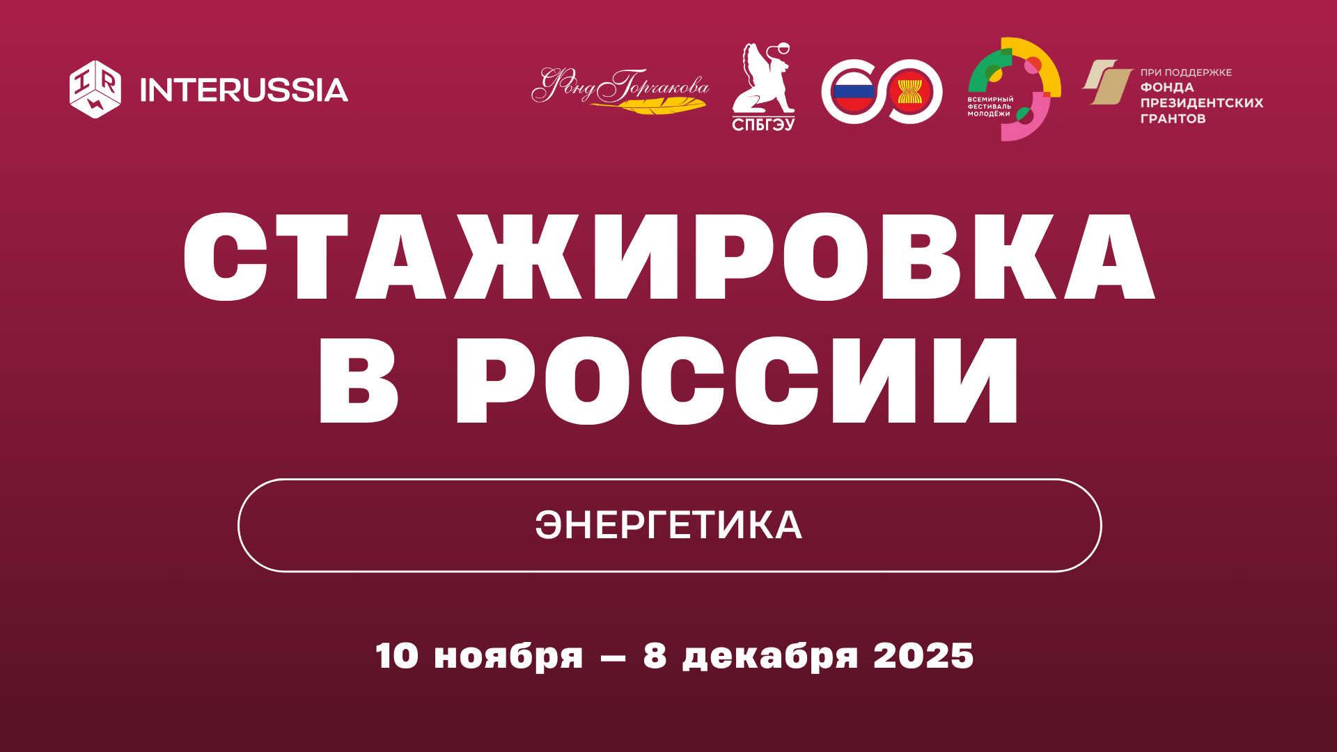 Программа стажировок InteRussia по энергетике для специалистов из стран АСЕАН реализуется АНО «Международники» совместно с Фондом Горчакова, Санкт-Петербургским государственным экономическим университетом (СПбГЭУ) и Деловым советом «Россия-АСЕАН», а также Дирекцией «Всемирного фестиваля молодежи» при грантовой поддержке Фонда президентских грантов.
