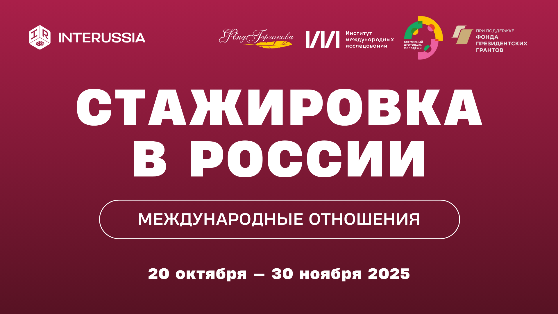 Программа стажировок InteRussia по международным отношениям реализуется АНО «Международники» совместно с Фондом Горчакова и Институтом международных исследований МГИМО МИД России, а также Дирекцией «Всемирного фестиваля молодежи» при грантовой поддержке Фонда президентских грантов.